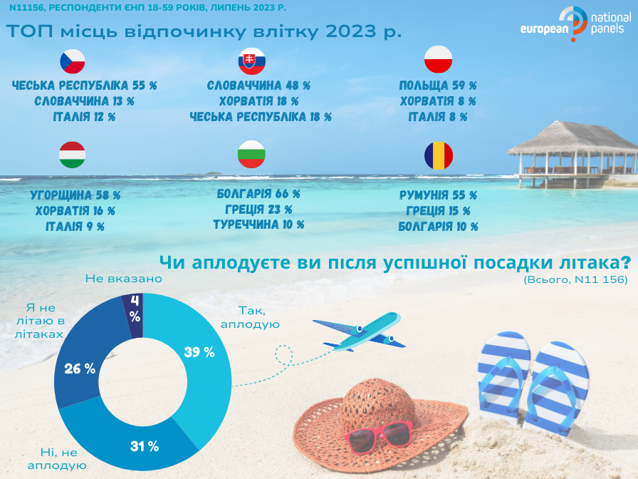 Майже ¾ наших респондентів (72%) планували цьогоріч поїхати у літню відпустку. Найбільша частка бажаючих відпочити – серед румунів (81%), чехів (76%) та болгар (74%). Навпаки, найменше прагнення до відпочинку спостерігається серед угорців (61%) та словаків (65%). У кожній з країн ЄНП значна частина опитаних вирішила провести свою відпустку цього року вдома. Не дивно, що трохи більше респондентів з країн, що мають власне море. 66% болгар і 62% румунів найбільше насолоджувалися відпочинком вдома цього року. Словаки мали найменшу зацікавленість у внутрішньому туризмі (48%), більше половини з них віддали перевагу відпочинку за кордоном.